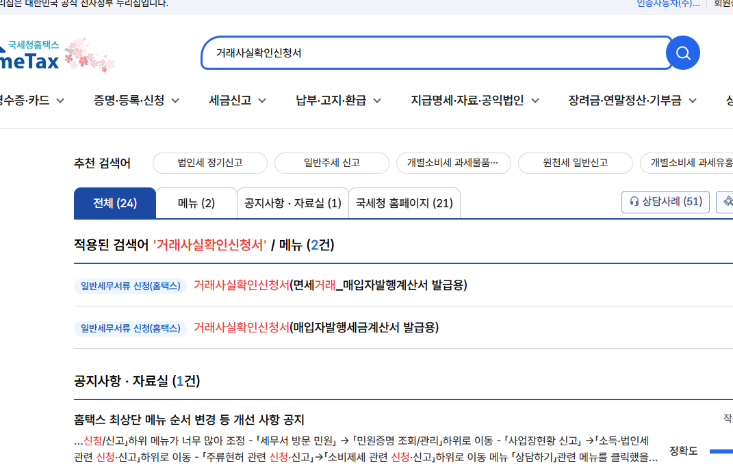 - 홈택스 상단 검색창에 '거래사실확인신청서' 입력 후 검색