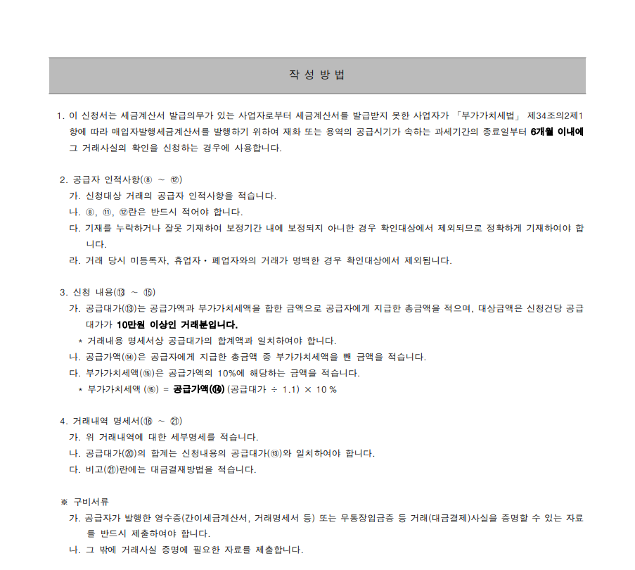 - 처리 절차: 세무서에서 거래 사실 확인 후 매입자가 세금계산서를 발행